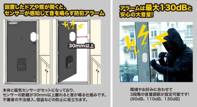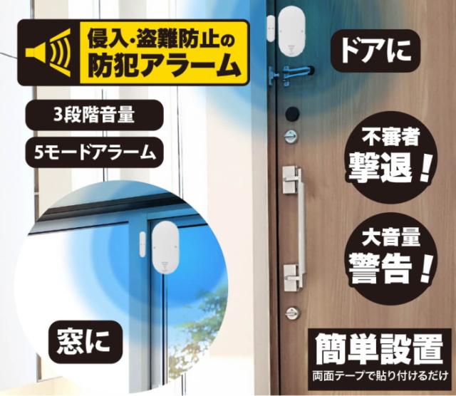 不審者の不法侵入、窃盗・盗難防止・防犯対策に役立ちます。設置したドアが開くと、センサーが感知して音を鳴らす防犯アラームです。本体と磁気センサーがセットになっており、センサーの距離が30mm以上離れると音が鳴る仕組み。取り付けたドアや窓が開かれたりするとアラームで知らせてくれます!取り付けは付属のテープで貼り付けるだけ!工事不要でお家のどこにでも簡単に設置できます。電源は電池式で、ON/OFFボタンひとつで電源操作が可能。ご高齢の方でも迷うことなく、どなたでも簡単に設置・操作ができます!アラームは最大130dBと安心の大音量!環境やお好みに合わせて3段階の音量調節が設定可能です。さらに本商品は用途によって使い分けができる5種類の動作モードを搭載。ドアが開くとブザーが鳴るモードや、お客様の来訪を知らせるピンポンといった音のモード、開きっぱなしを知らせてくれるモードまであります。