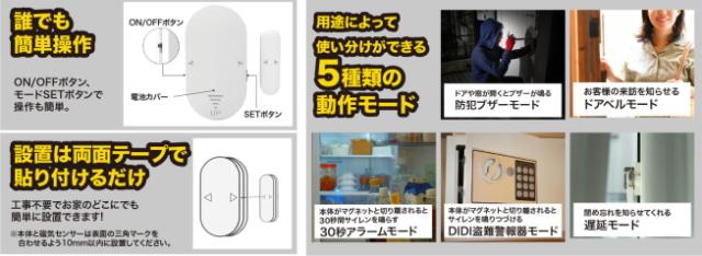 【商品サイズ】本体:約W3.4×D1.65×H6.5cm【材質】ABS【スペック】■磁気センサー:約W1.4×D1.0×H3.6cm■電源:ボタン電池3個付属■アラーム音量3段階調節可能(90dB、110dB、130dB)■検知モード5種類搭載■使用温度範囲:-10〜50℃■定格電圧:1.5V 定格電流:70mA■連続使用時間:約200日間(アラームが1日あたり30秒間なった場合)【セット内容】:本体、磁気センサー、粘着テープ、取扱説明書兼保証書、ボタン電池3個(動作確認用)