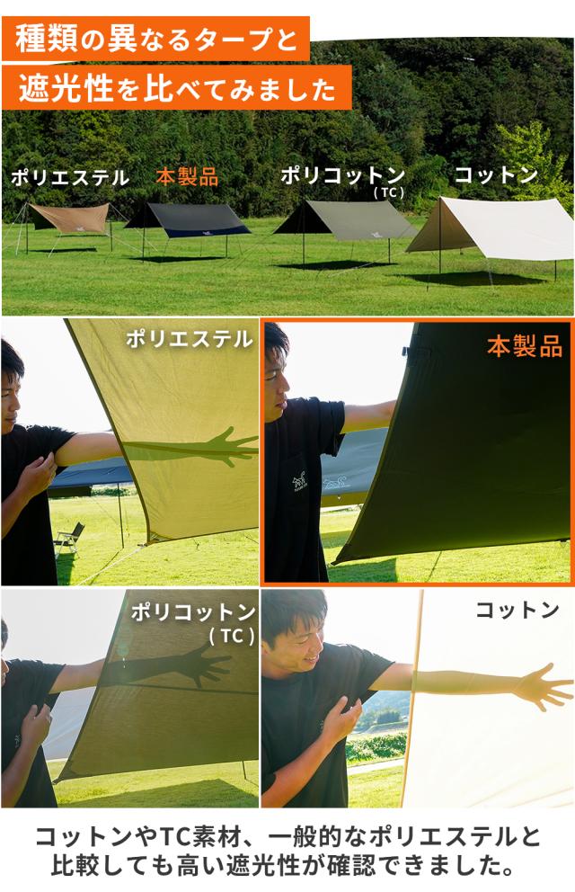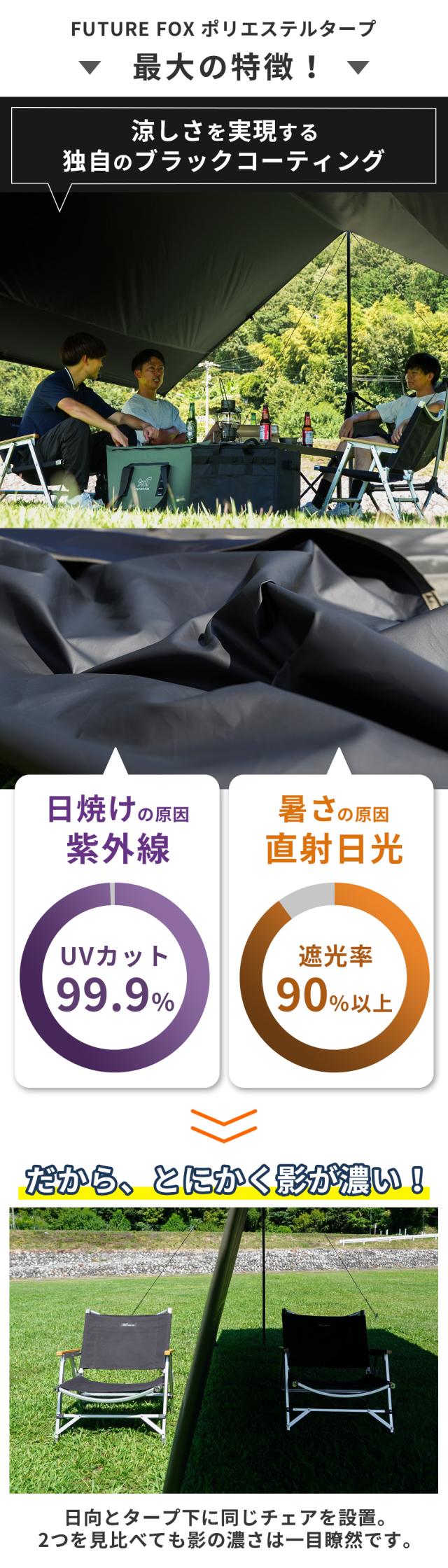 圧倒的な涼しさを求める方にぴったりな、ポリエステル製のスクエアタープです。タープ裏面に独自のブラックコーティングを施しており、遮光率90%以上、UVカット率99.9%を実現しました。ポリエステルなのに、コットンやポリコットンのタープにも劣らない涼しさを提供します。