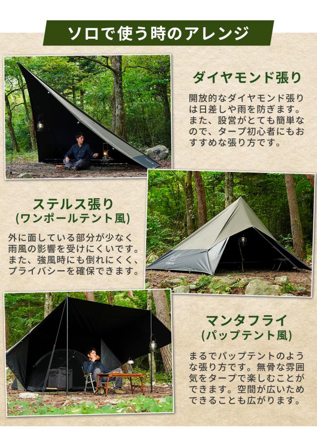 スクエア型のタープは、テントのようにして使うことも可能です。