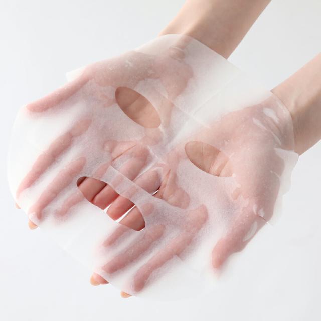 1. 洗顔後すぐのお肌にご使用ください。清潔な手で袋からマスクが破けないように丁寧に取り出し広げます。