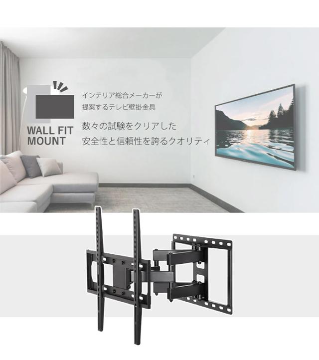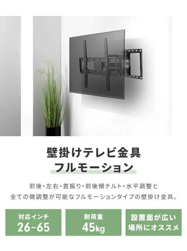 キーワード: テレビ 壁掛け 金具 壁面 アーム 大型 壁掛けテレビ 可動 ダブルアームタイプ 汎用タイプ テレビ壁掛け金具 角度調節 TV壁掛金具 パナソニック 東芝 シャープ ソニー V 65 60 50 49 43 42 40 32 26 26〜65V 壁掛け TV 金具 アーム式 ネジ固定 角度調整 ストッパー付属 安定感 耐荷重45kg 前後傾チルト 設置面が広い 首振り 水平調整 DIY リビング 寝室 オフィス 待合室