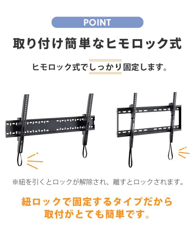 | 高い場所に設置するなら上下にチルトできる壁掛け金具。 病院やお店など高い場所に設置するなら上下角度の変えられるチルトタイプがおすすめです。 下向きの角度に設定しておけば快適にテレビが視聴できます。 [金具奥行]50mm (金具設置壁面〜ディスプレイ背面までの距離) [VESA取付幅]75〜800mm [VESA取付高]※75〜400mm [後傾/前傾]後傾 5°/前傾 15° [ロック方式]ヒモロック ※紐を引っ張るとロックが解除され紐を離すとロックされます。 壁面への取り付けネジは同梱されておりません。 |
