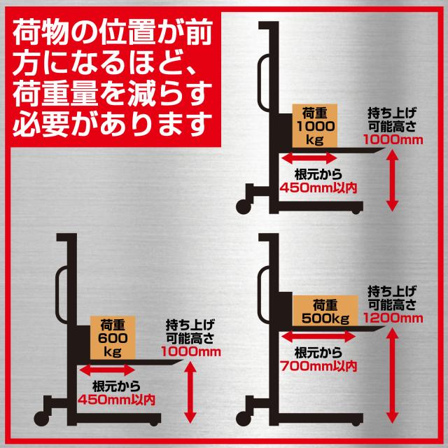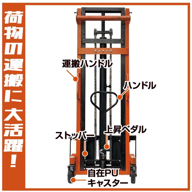 ハンドレバーを下ろすか上昇用ペダルを上下するとフォークが持ち上がります。