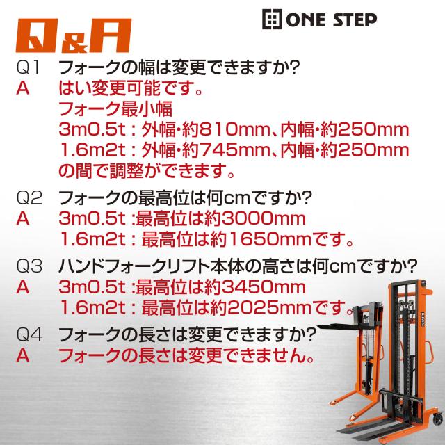ハンドフォークリフト 低床 最大積載2000kg 2t 最高位1650mm フォーク長さ990mm 幅320-735mm