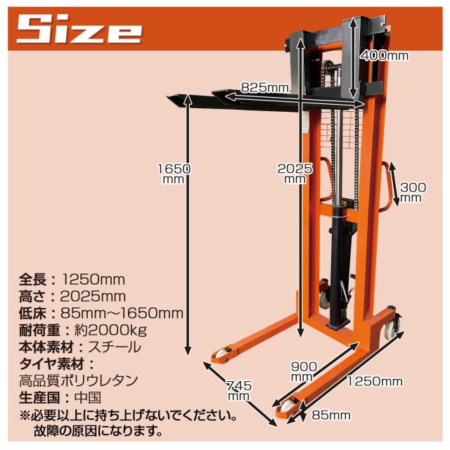 ハンドフォークリフト 低床 最大積載2000kg 2t 最高位1650mm フォーク長さ825mm 幅250〜745mm 油圧式 リフト 台車 フォークリフト 低床 手動 昇降 スタッカー ハンドリフト