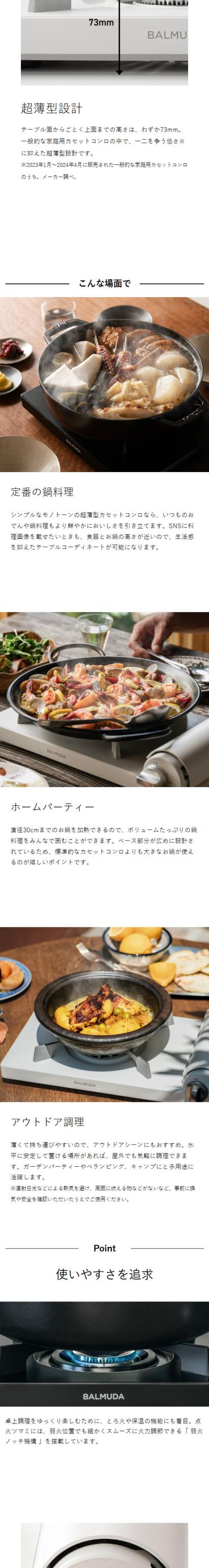 「BALMUDA」からスタイリッシュな薄型カセットコンロが登場。幅広・極薄の本体だから、座ったままでも取り分けがラク。10号サイズまでの土鍋や直径30cmまでのナベなどを加熱できます。