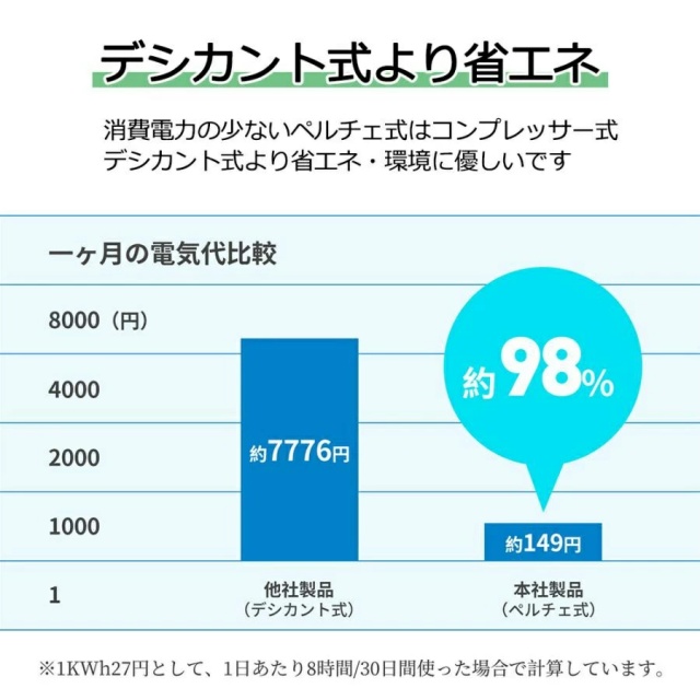 ペルチェ式除湿機で、ジメジメした空気を吸い込み、結露させることで余分の湿気を取り除き、さらさら快適空間に。600ML/日のハイパワーでスピード除湿、湿気によるカビ・結露・異臭などいろんな悩みを一気に解決。