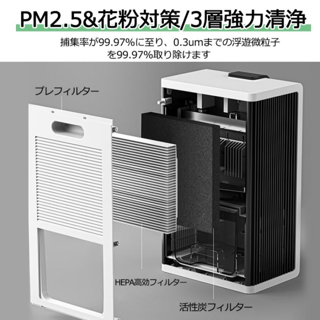 超細密不織布集塵フィルターにより、空気中の花粉、ほこり、アレル物質などを強力吸着、マイナスイオンを放出することで、臭いの元やカビなどを分解し、浮遊菌を減少して、部屋干しの生乾き臭を抑え、新鮮な空気を提供するなどの空気清浄効果があり。