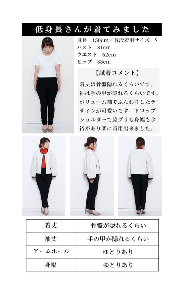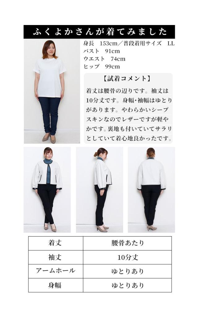 着丈は骨盤隠れるくらいです。袖は手の甲が隠れるくらいです。ボリューム袖でふんわりしたデザインが可愛いです。ドロップショルダーで脇グリも身幅も余裕があり楽に着用出来ました。上にホックで1箇所止めるところがあり、サッと羽織れるのがいいですね。柔らかい皮で軽く、肌触りもとても良かったです。