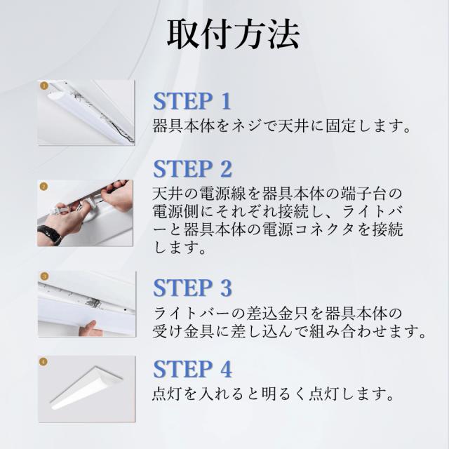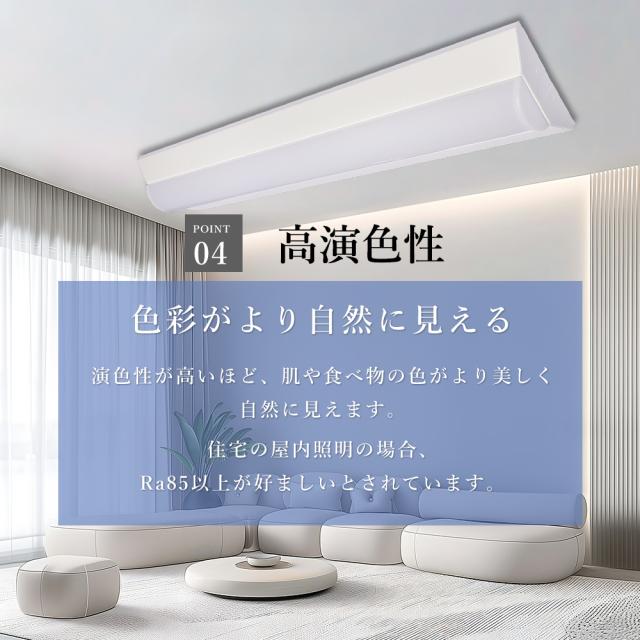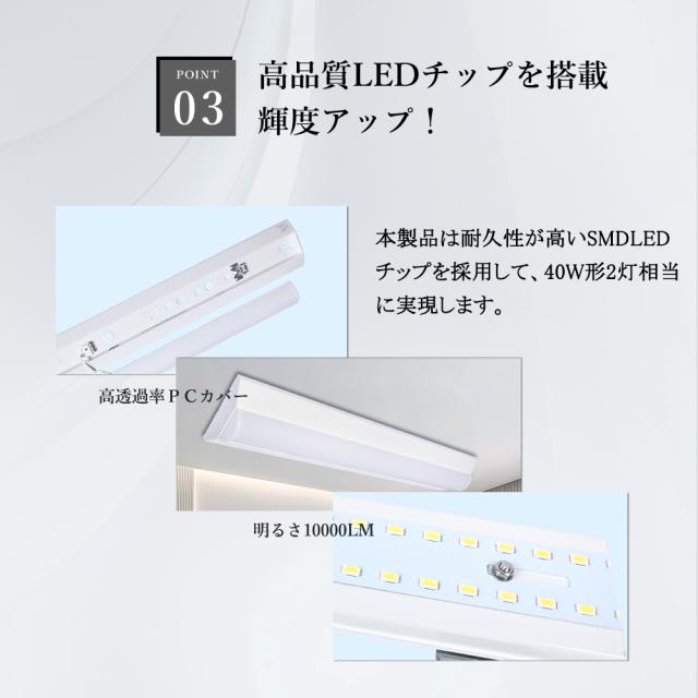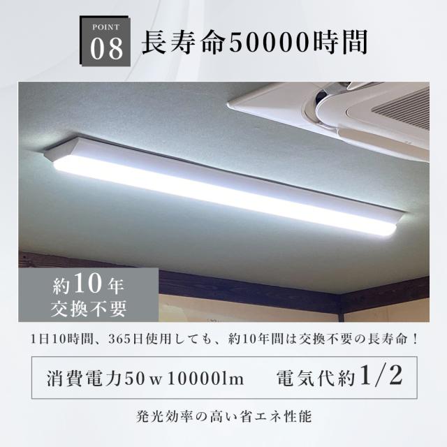 - このLEDベースライトは低消費電力でありながら、明るく均一な高効率の発光を実現しています。省エネ設計により、電気料金の削減と環境への負荷軽減が期待できます。1台のLEDベースライトは、従来の蛍光灯2本分の明るさを提供します。また、一度設定すれば約10年間の交換が不要です。