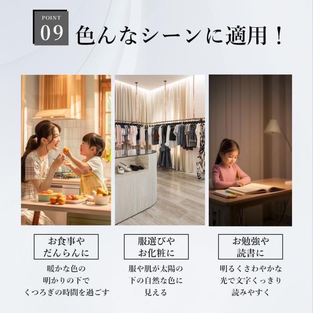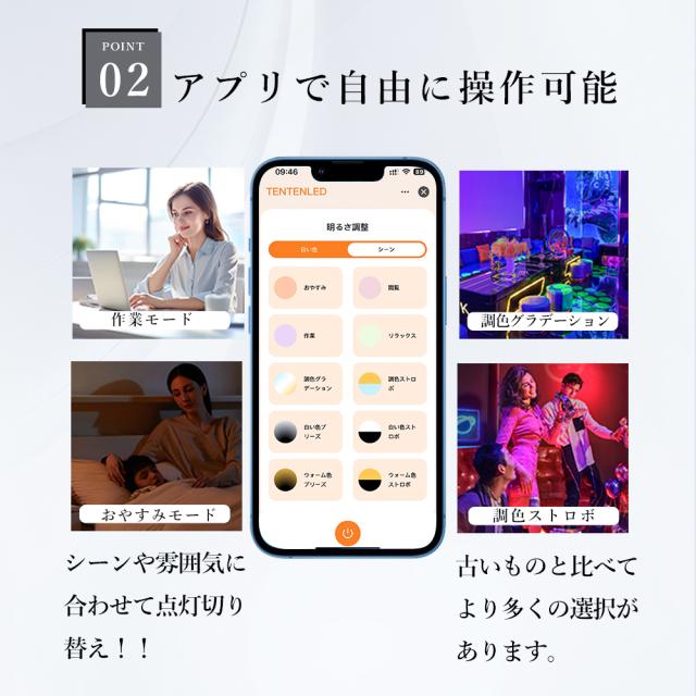 - 本製品は、壁スイッチ、リモコン、スマートフォンアプリの3つの操作方法があり、非常に便利です。壁スイッチで簡単にオンとオフができ、専用のリモコンを使用すれば離れた場所から照明の明るさや色を調整できます。スマートフォンアプリでは、明るさや色温度、タイマー、プリセットシーンなど多様な機能を自由に設定でき、快適な照明環境を実現します。