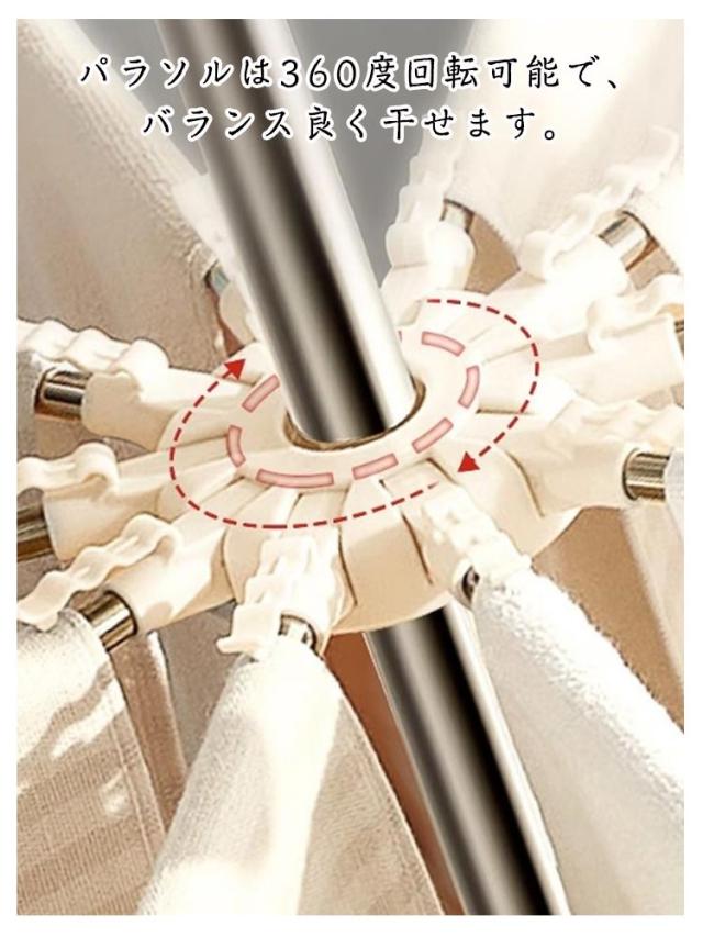 | 小物からタオルまでいろいろ干せる!シンプルで使いやすい物干しパラソルです。 ハンガー30個、ピンチ60個付きなので、大小様々な洗濯物を干せます。 ステンレス製でサビに強く丈夫だから使いやすい。 ハンガーを取り外して竿に掛ければ、ピンチハンガーとしても使用できます。 防風ラックが付き、服をハンガーに固定させ、風に吹かれても落ちることはありません。 パラソルは360度回転可能で、バランス良く干せます。 使用しないときはパラソルを閉じるだけでコンパクトに折りたためます。 脚は4本構造になっているので安定感はバツグン!しっかりしたバランスでたっぷり干しても◎ 室内、ベランダ、室外等のところに全部有効利用可能です。 | |