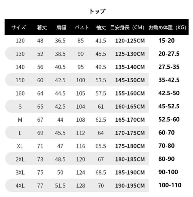 | サイズ | 120cm 130cm 140cm 150cm 160cm S M L XL 2XL 3XL 4XL |