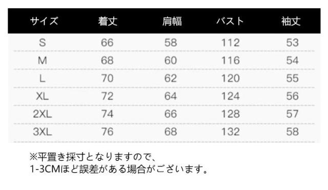 | サイズについての説明 | サイズ 着丈 肩幅 バスト 袖丈 ※平置き採寸となりますので、1-3cmほど誤差がある場合がございます。 |