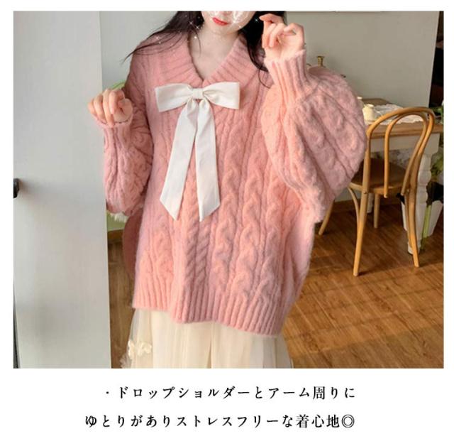 ニット Vネック ニット リボン セーター ケーブル編み ざっくり レディース 長袖 ボリュームスリーブ 体型カバー 可愛い