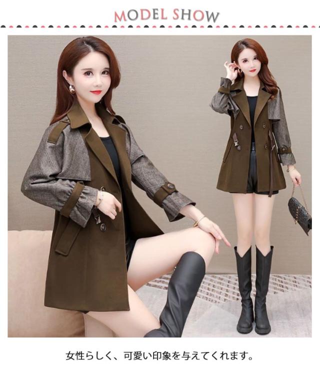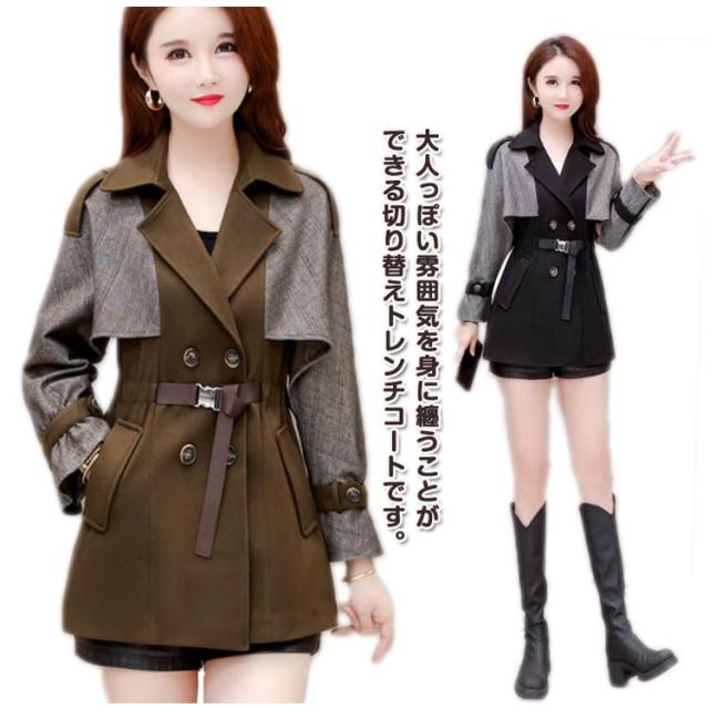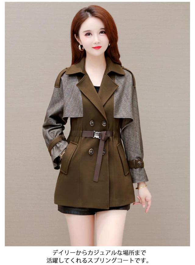 配色 切り替え トレンチコート レディース スプリングコート 秋 冬 コート ショート丈 フォーマル ビジネス ライトアウター 大きいサイズ 春アウター シャーリング シンプル 裏地付き M L XL 2XL 3XL 4XL