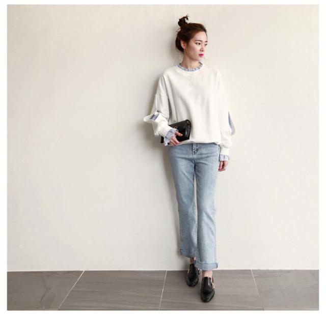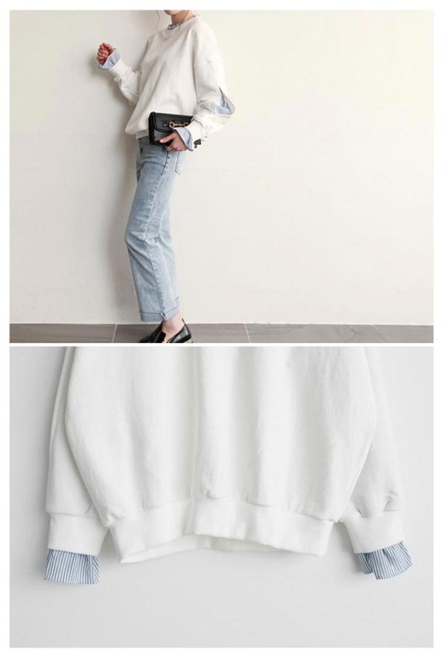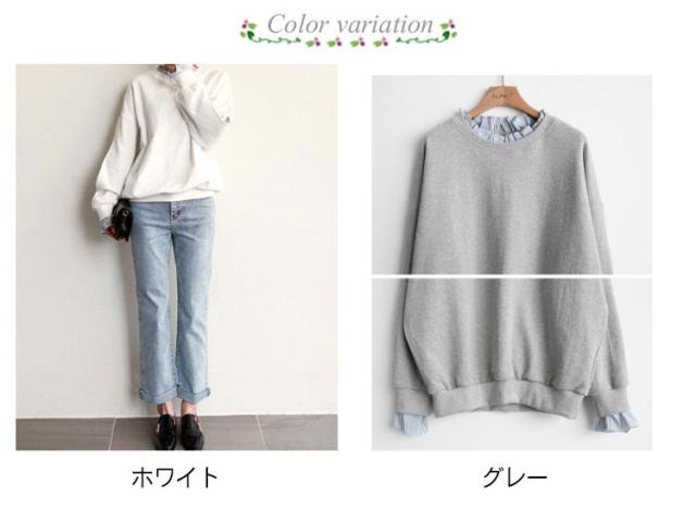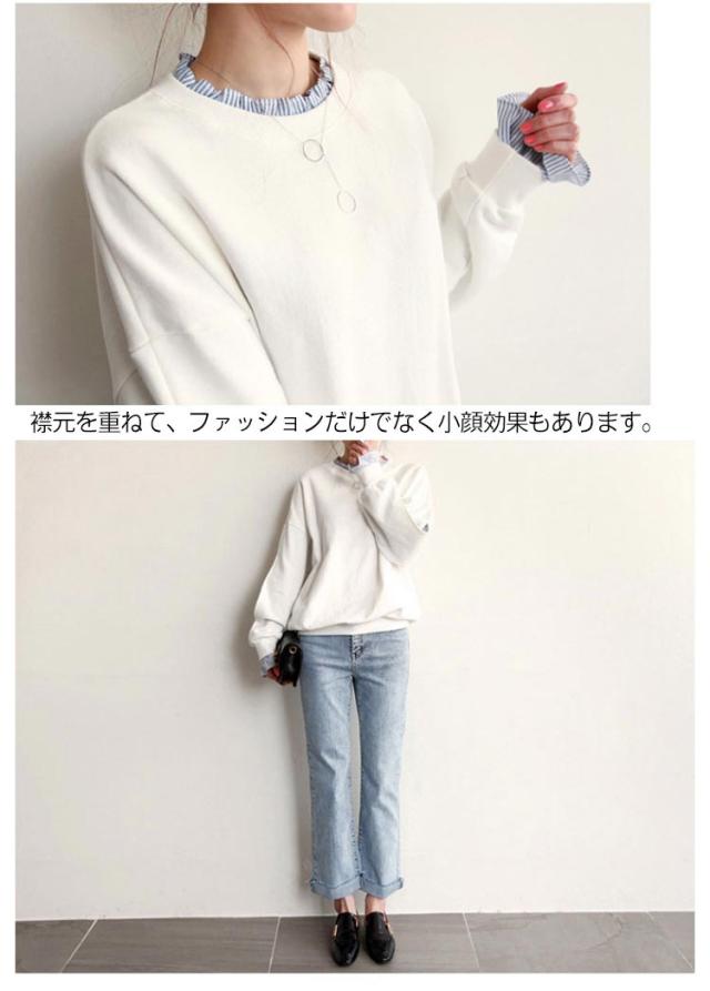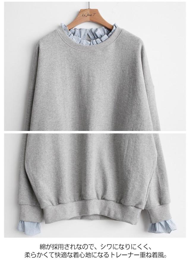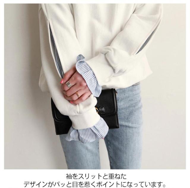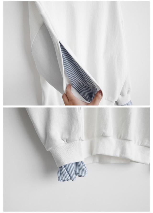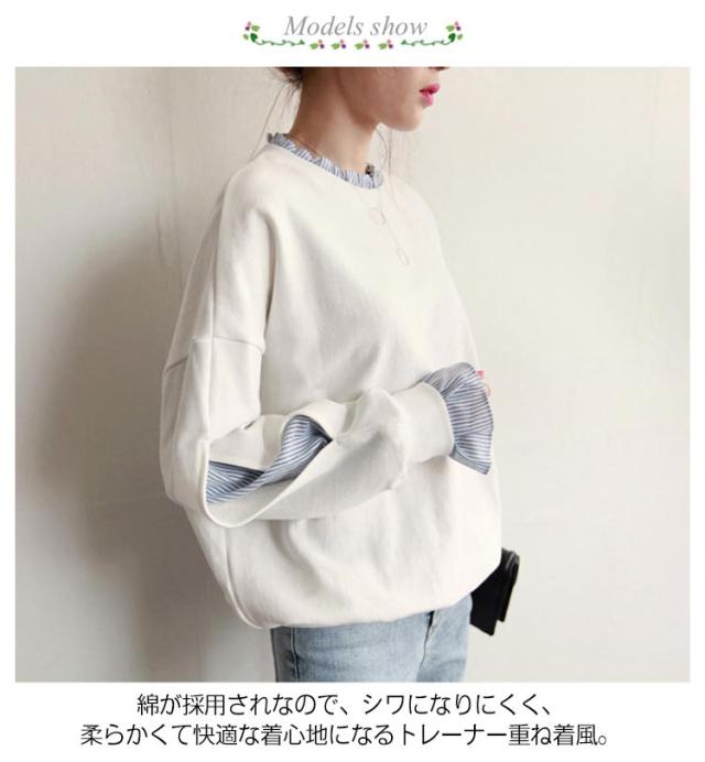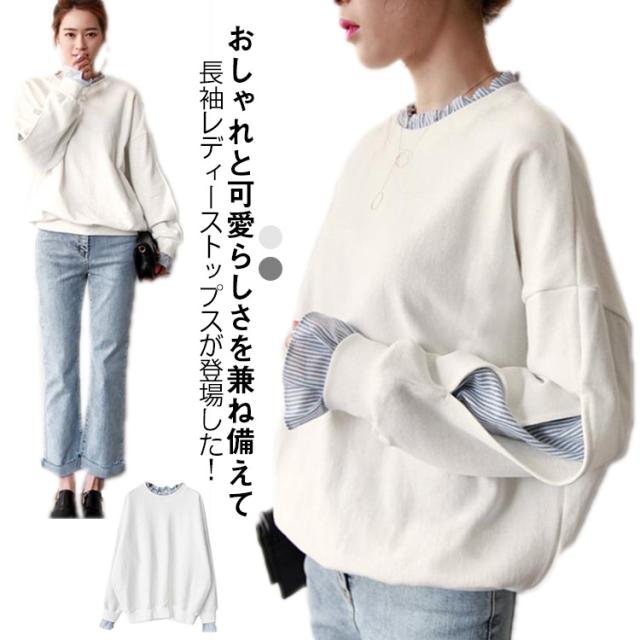 プルオーバー 長袖 冬 秋 異素材 レディース パーカー スウェット スウェット クルーネック ブラウス レイヤード風 ドッキング 切替 カットソー ストライプ柄 おしゃれ 韓国 ゆったり カジュアル 大きいサイズ 通勤
