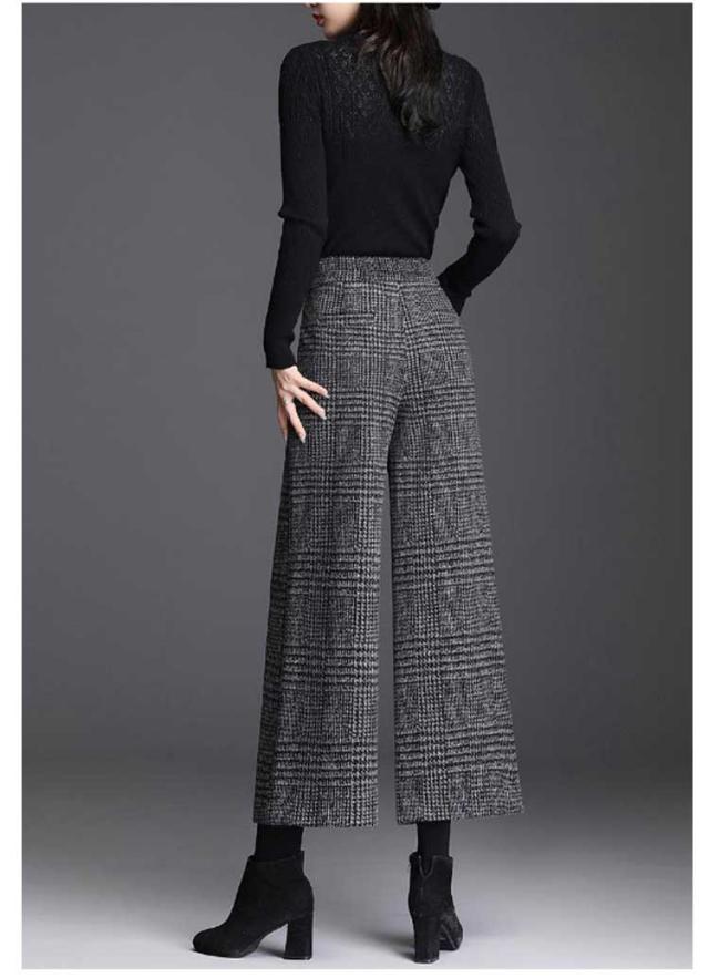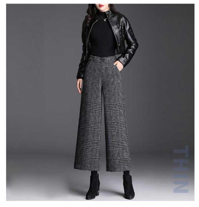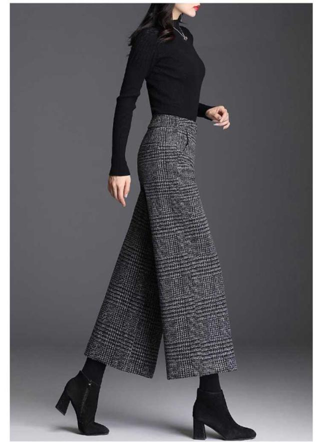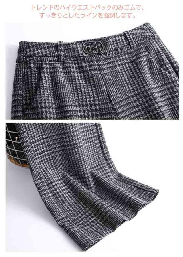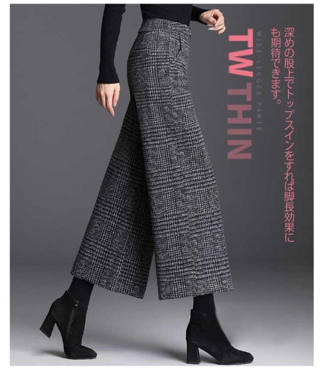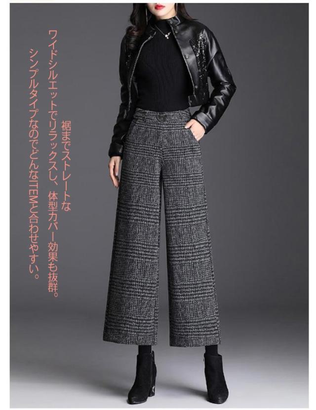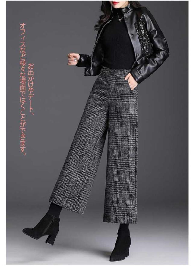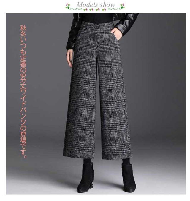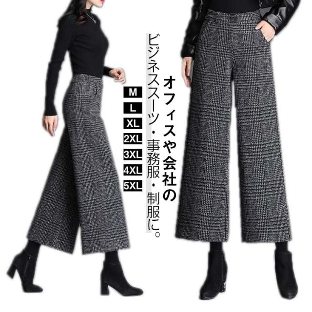 レディース 秋冬 防寒 ボトムス 通勤 9分丈 チェック ワイドパンツ キレイめ ハイウエスト 大きいサイズ 厚手 ワイドパンツ オフィス 体型カバー カジュアル 30代 40代