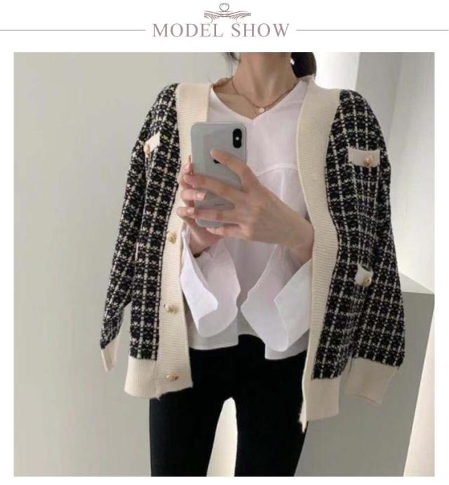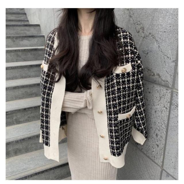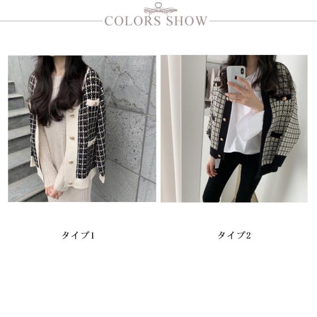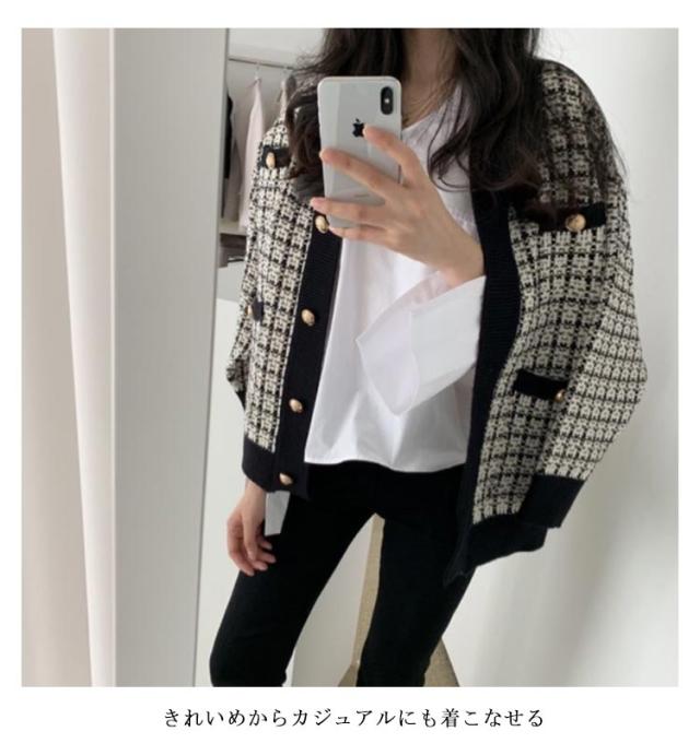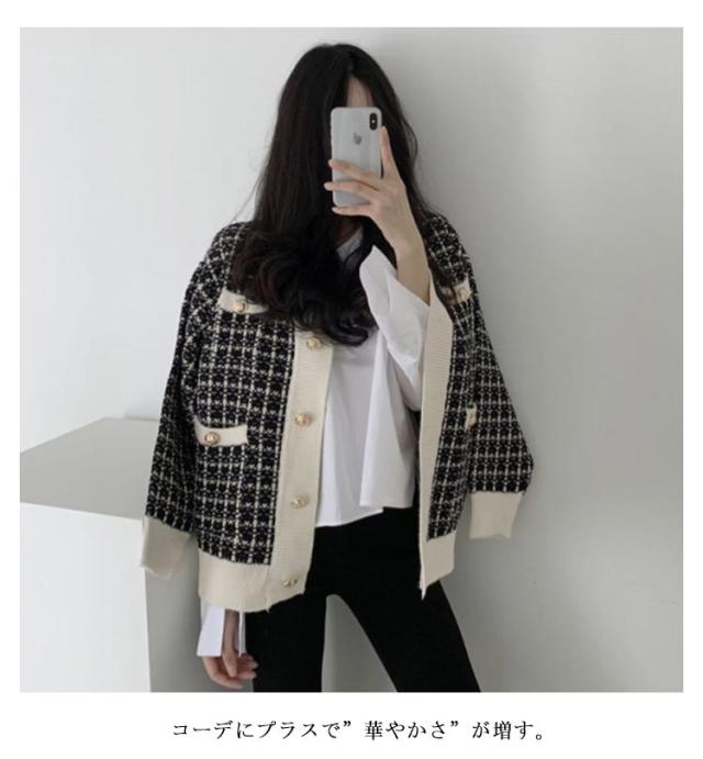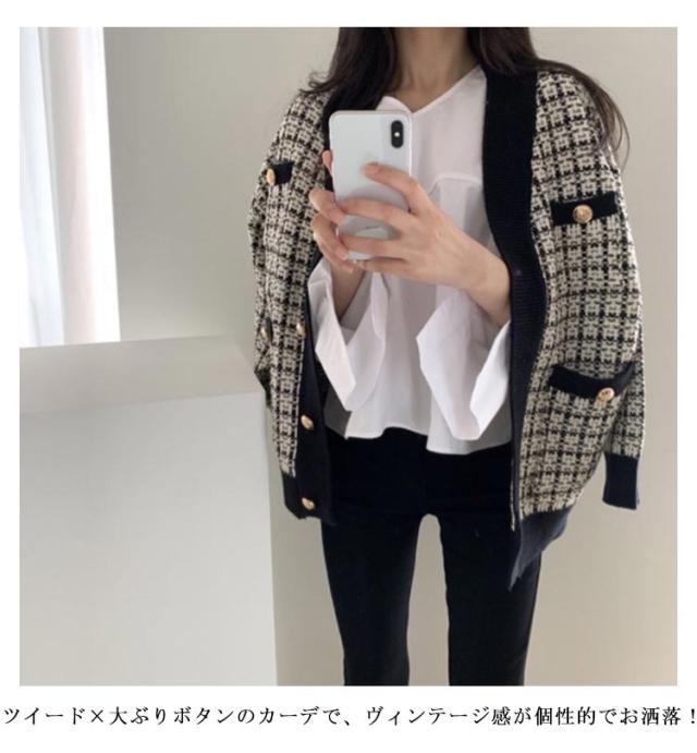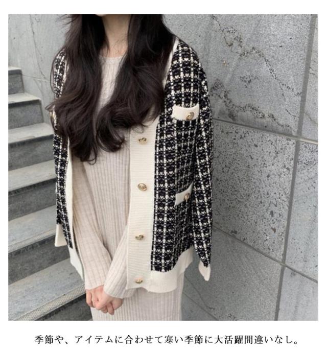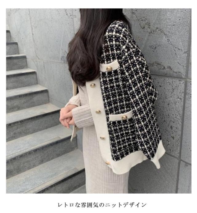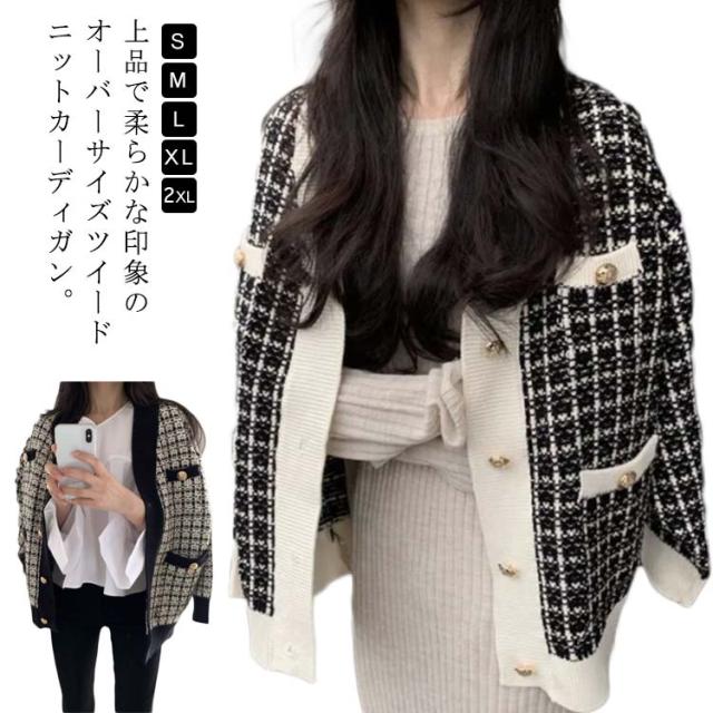 春 長袖 ボレロ ツイードニットカーディガン ツイードニットカーディガン レディース カーディガン オーバーサイズ ビッグシルエット チェック柄 厚手 秋冬 体型カバー お洒落 可愛い オフィスカジュアル 秋 冬 黒白 トレンド