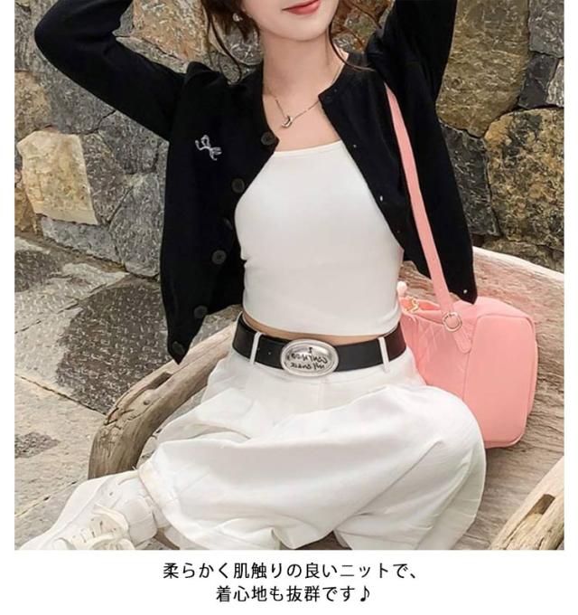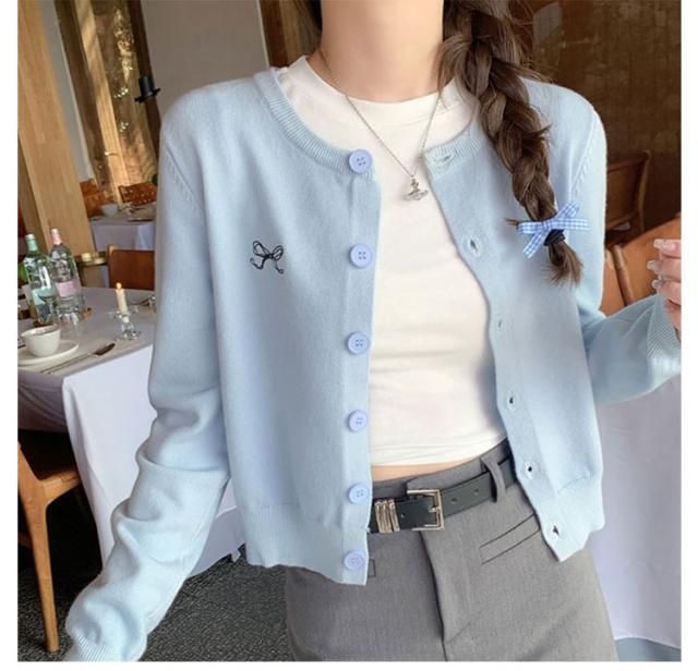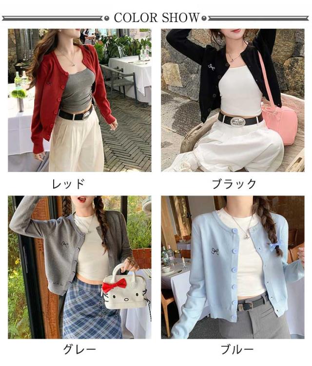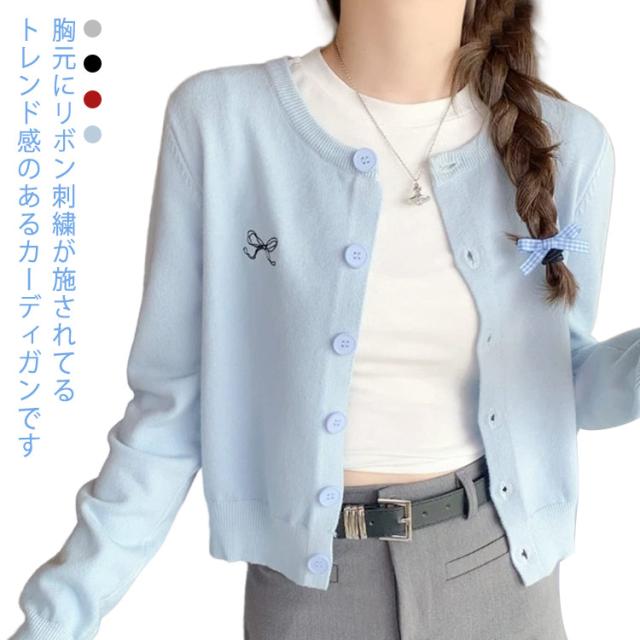 刺繍 前開き カーディガン ニット 暖かい レディース 冬 ニットカーデ ショート丈 春 リボン 秋 羽織り カーディガン 長袖 トップス リボン クルーネック セーター アウター 薄手 かわいい 通勤 通学 秋冬 水色 グレー 赤 黒