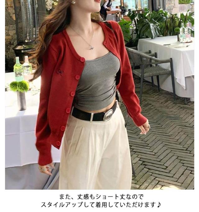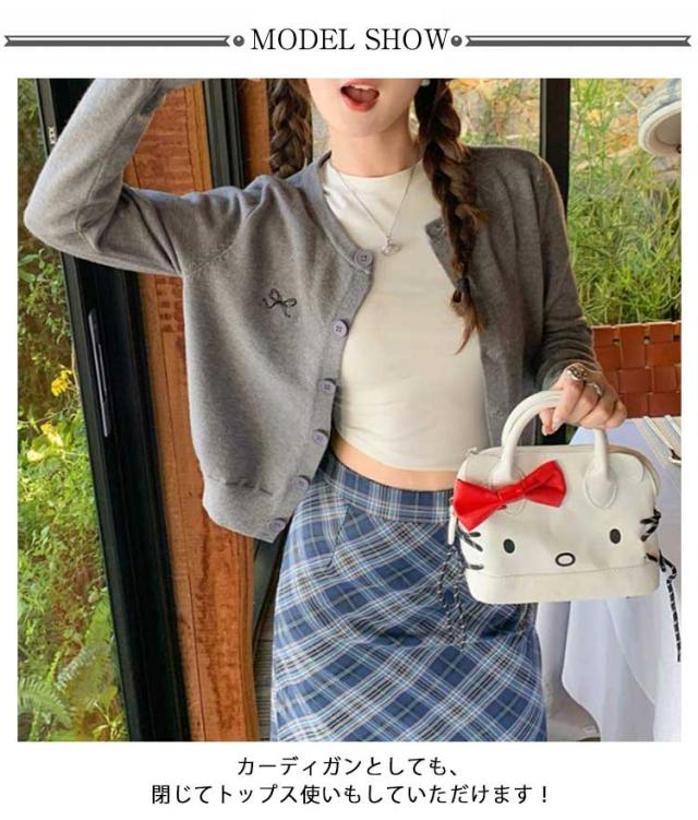 | 胸元にリボン刺繍が施されてるトレンド感のあるカーディガンです。 カーディガンとしても、閉じてトップス使いもしていただけます! 柔らかく肌触りの良いニットで、着心地も抜群です♪ また、丈感もショート丈なのでスタイルアップして着用していただけます♪ | |