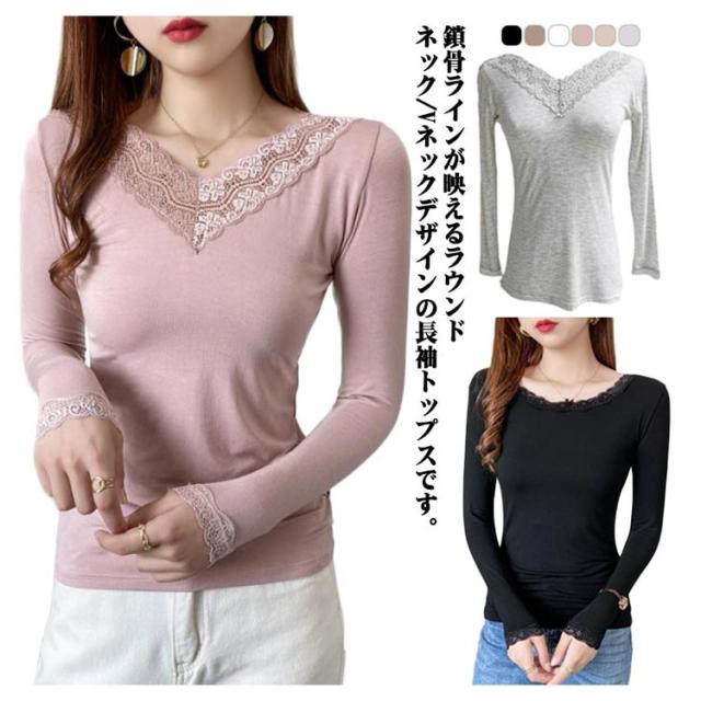 長袖 胸元 カットソー 選べる襟 レース インナー Vネック 長袖 きれいめ 薄手 レディース M Tシャツ ラウンドネック インナー 胸元 冬 トップス シンプル かわいい おしゃれ オフィス カジュアル 重ね着 フェミニン S 秋 L XL 2XL