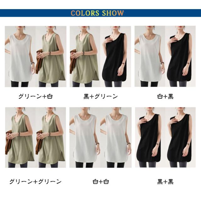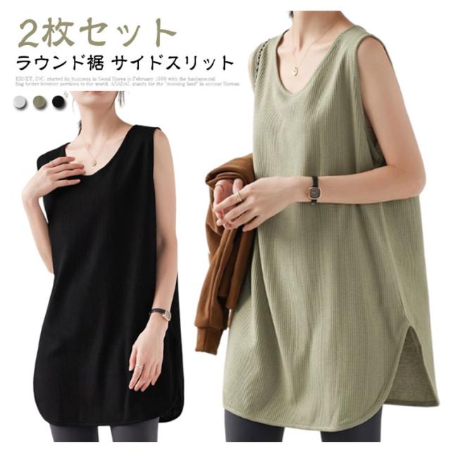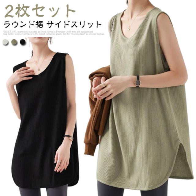 【2枚セット】ラウンド裾 トップス タンクトップ 重ね着 体型カバー ロング丈 インナー サイドスリット ロングタンクトップ 【2枚セット】ラウンド裾 レディース レイヤード ラウンドネック ゆったり お尻カバー 大きいサイズ ワッフル素材