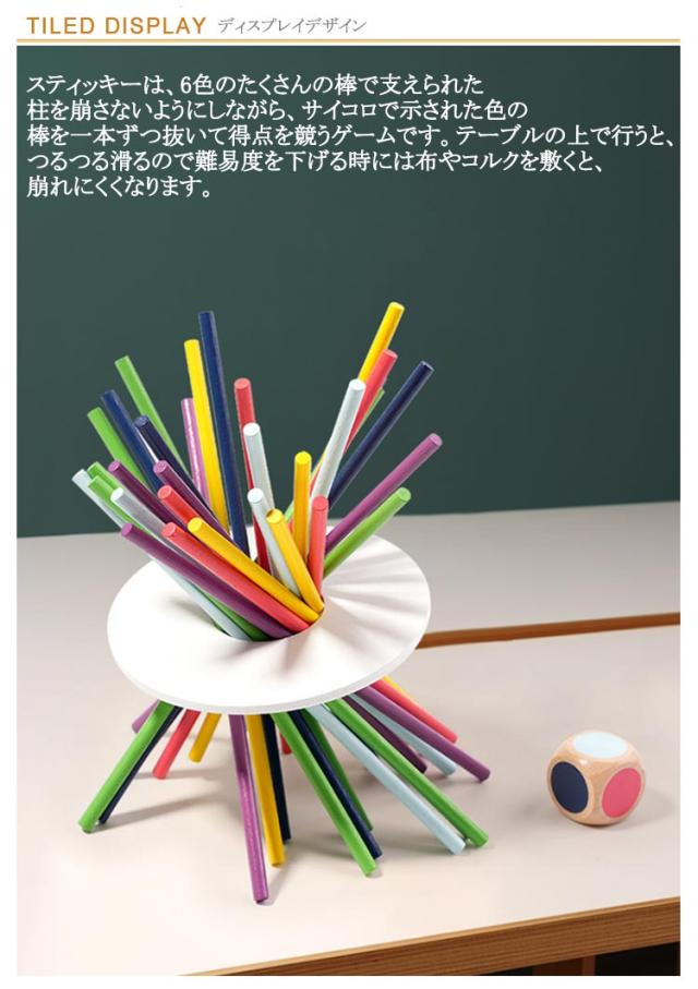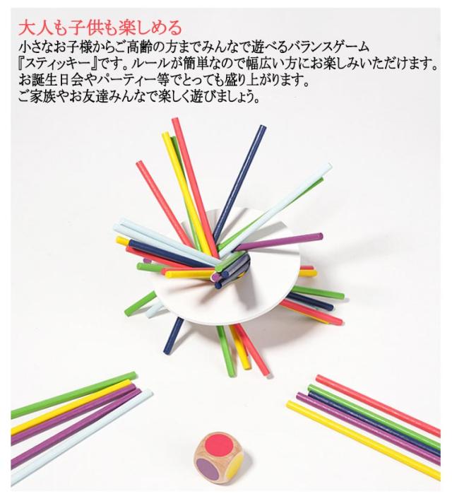 | 32点セット 【バランスゲームスティッキー】 スティッキーは、3色のたくさんの棒で支えられた柱を崩さないようにしながら、サイコロで示された色の棒を一本ずつ抜いて得点を競うゲームです。テーブルの上で行うと、つるつる滑るので難易度を下げる時には布やコルクを敷くと、崩れにくくなります。 【無限の楽しみ】 ハンデとして、大人は一度触ったスティックは絶対に抜かなければ行けない…とか利き手と反対側の手を使う…などとすると、本気でお子様とゲームをしてもお父様・お母様が負ける事もしばしば。 【美しいデザイン】 お部屋のインテリアにも耐えうる美しいデザインだけではなく、お子様の成長を自然に促す遊びの豊かさにも優れています。赤ちゃんが五感でものをとらえようとする思いを促し、成長にともなった年齢にふさわしい体験が得られるように作られています。 【色彩の楽しさ】 製品に色彩の楽しさを添えるために、溶剤を含まず自然に優しい水溶性ラッカーだけを使用しています。何層にも塗装を繰り返すことで強い塗膜ができあがり、使用による衝撃や水分による損傷を防ぎます。 【大人も子供も楽しめる】 小さなお子様からご高齢の方までみんなで遊べるバランスゲーム『スティッキー』です。ルールが簡単なので幅広い方にお楽しみいただけます。お誕生日会やパーティー等でとっても盛り上がります。ご家族やお友達みんなで楽しく遊びましょう。 | |