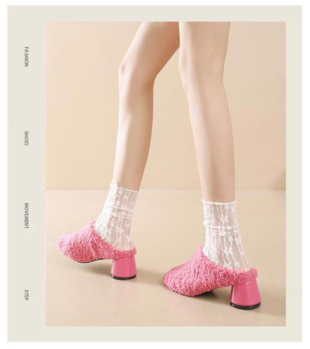 ファーパンプス もこもこボア チャンキーヒール ボアサンダル おしゃれ かかとなし ハイヒール シューズ つっかけ ボアサンダル サンダル パンプス 靴 滑り止め 履きやすい 痛くない 秋冬