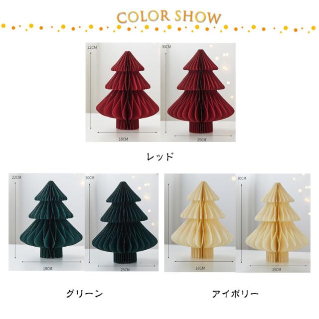 | 飾りやすい卓上サイズのクリスマスツリー。【ペーパー製】【30cm・22cm】【2個セット】 ペーパー部分が蛇腹構造になっており、開くと360°立体的なツリーになります。 折りたたみ式でコンパクトなので、収納場所にも困りません。 どこにでも置きやすいミニサイズのツリーなので、テーブルの上や玄関などちょっとしたスペースに飾れます。 ボリューム感たっぷりで存在感のあるデザインに仕立てました。 手軽にクリスマス気分をお楽しみいただけます。 | |