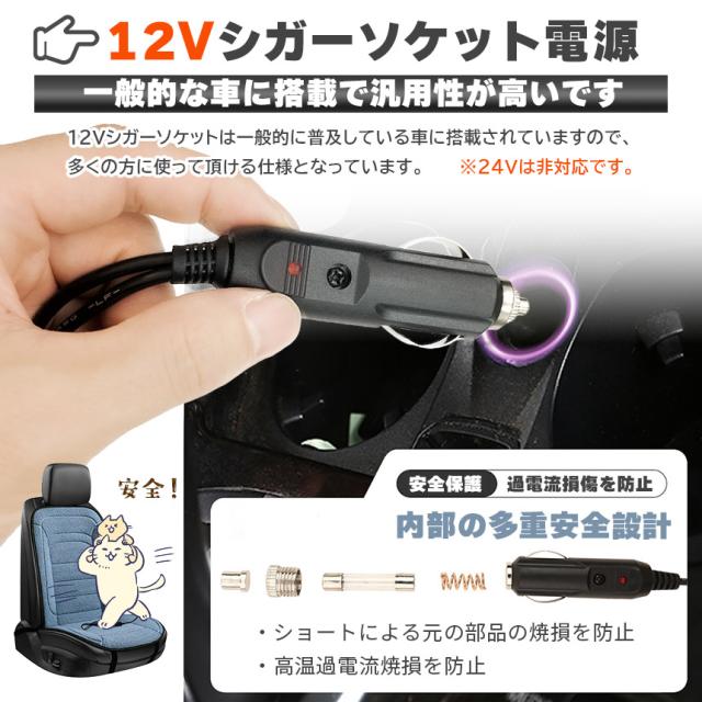 12Vの車専用、車のシガーソケットに差し込むだけのシンプル設計。