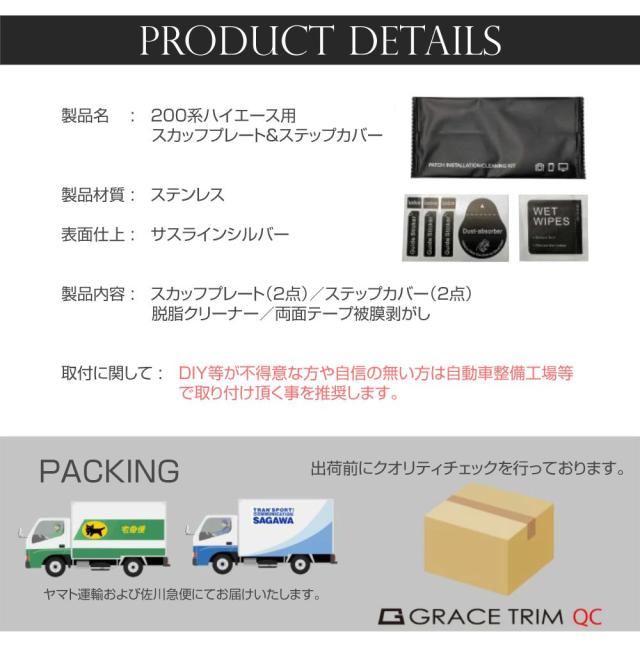 TOYOTA 200系 ハイエース専用のフロントドアのサイドステップに装着するスカッフプレート4枚セットです。 必ず傷がついてしまうドアステップまわりを保護します。 傷、衝撃からサイドステップを保護すると同時に高級感アップ! 専用設計でしっかりフィット。 取付は両面テープで貼りつけるだけの簡単装着。 |