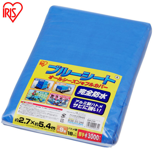 ブルーシート 厚手 防水 #3000 2.7×5.4m 3000 ハトメ 防水シート 屋外 床 ベランダ 屋根 養生 アウトドア レジャー 大きい 防災 防寒 アイリスオーヤマ B30-2754C *