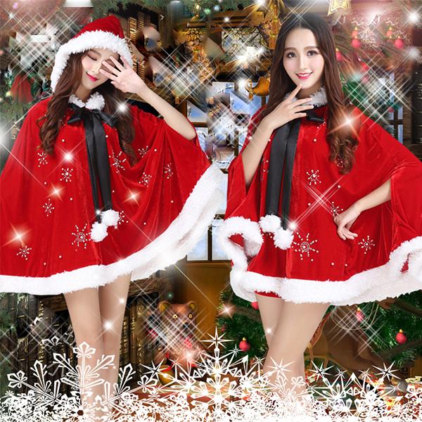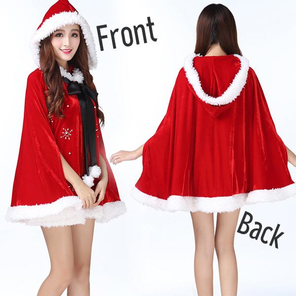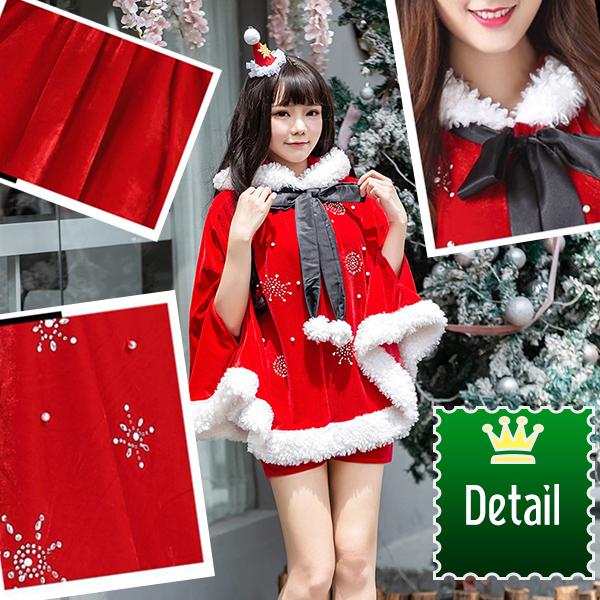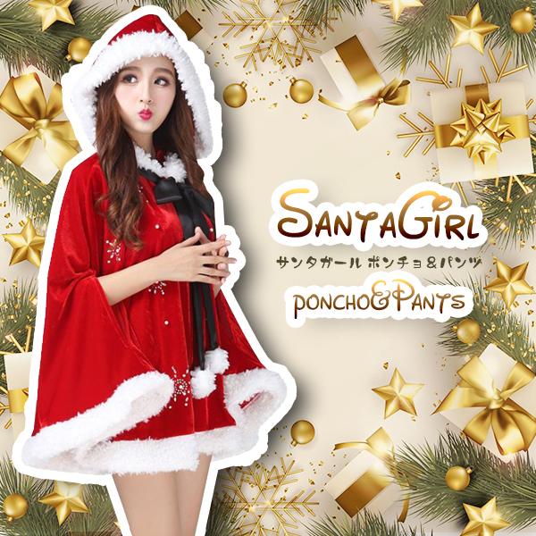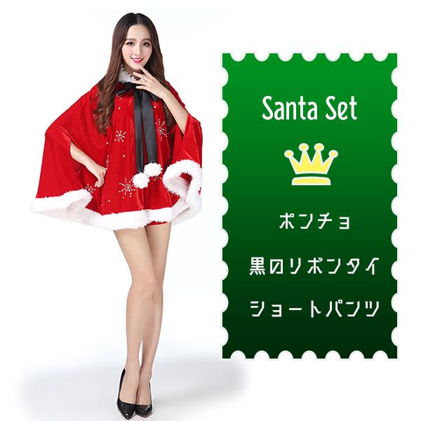 サンタガール ポンチョ&パンツ リボンタイ 3点セット サンタクロース コスプレ フード マント ケープ フリーサイズ クリスマス 舞台 新年会 文化祭 送料無料
