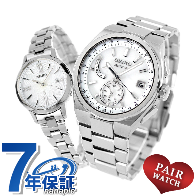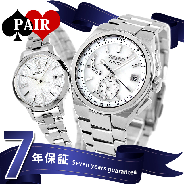 正規品 7年保証キャンペーン 送料無料 ペアウォッチ セイコー アストロン ルキア 日本製 メンズ レディース 腕時計 pair-seiko108 SEIKO ASTRON LUKIA アナログ ホワイト シルバー ◆メンズモデルは、Nexter ソーラー電波ワールドタイムからアストロンシリーズで人気のカラーリングモデルが登場。腕なじみの良いコンパクトなケースサイズ、上面に力強い縦筋目を施したソリッドなチタンベゼルが、スタイリッシュな印象を与えます。レディースモデルは、セイコールキアから、真っ直ぐに凛と咲く「カラーリリー」をデザインモチーフにしたソーラー電波時計。ダイヤルベースは花びらの質感をイメージし、外周にかけて少しカーブがかった繊細なパターンの型打ちを採用。思わず見入ってしまうほどの美しい仕上げになっています。どんなスタイルでも合わせやすいデザインです。 メンズ品番:SBXY085 レディース品番:SSVW205