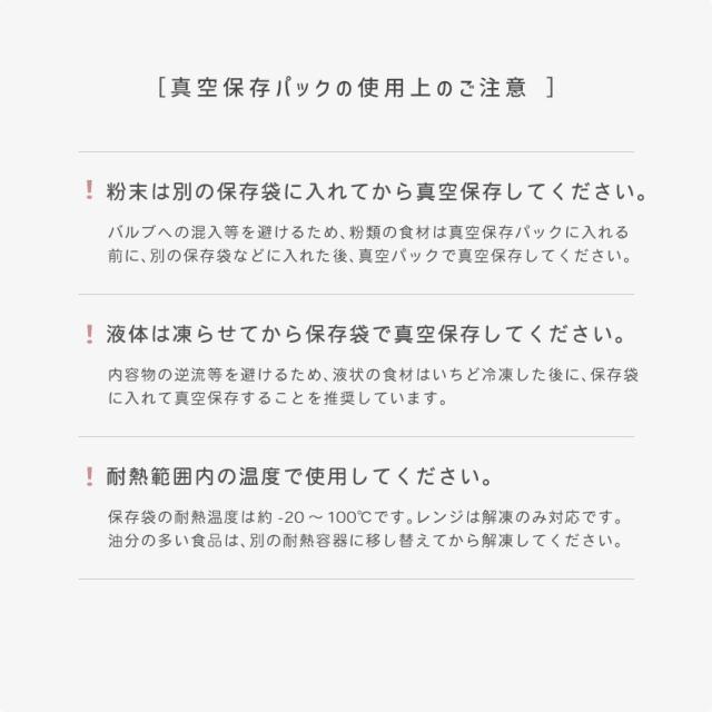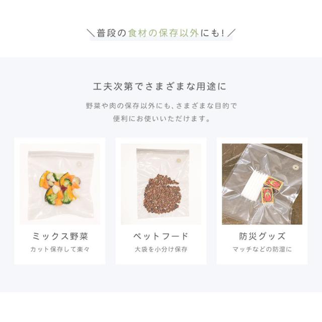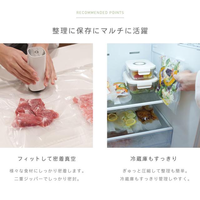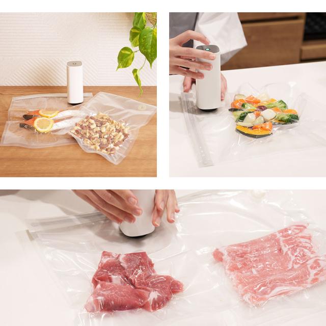 | 【調理にも便利な真空保存パック】 ぴったりフィットして密封!かさばらないからすっきり収納。 |