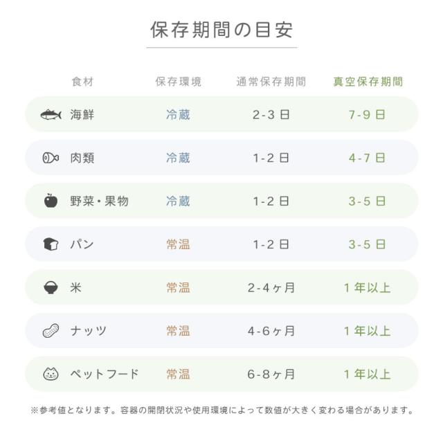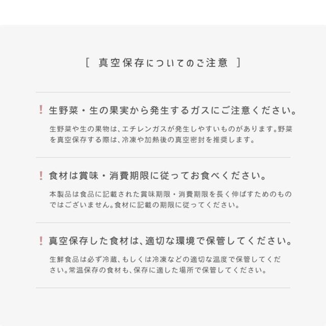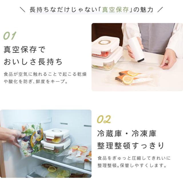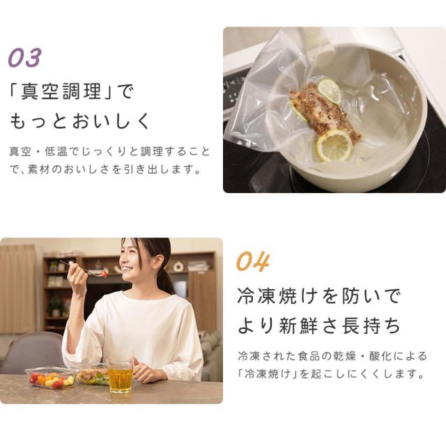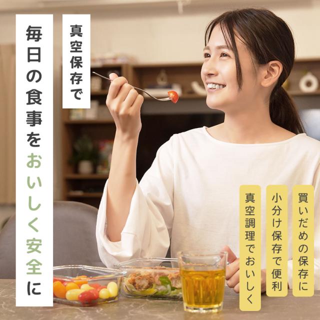 | 【真空保存でおいしさ長持ち】 食品が空気に触れることで起こる乾燥や酸化を防ぎ、鮮度をキープ。 |