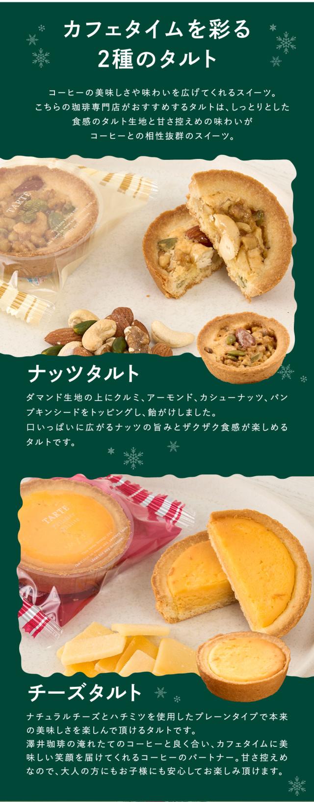 | 内容量 | ●ドリップバッグコーヒー ・クリスマスブレンド 8g×5袋 ・クリスマスdeノエルブレンド 8g×5袋 ●タルト ・ナッツタルト 1個 ・チーズタルト 1個 |