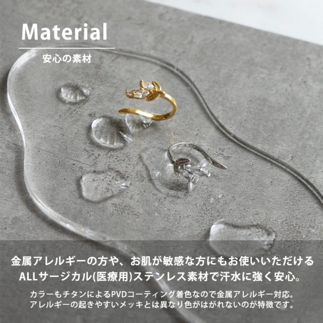 素材には金属アレルギーの方にも安心なサージカルステンレスを使用。使い勝手の良さとデザインが魅力的なステンレスイヤーカフを是非お試しください。シルバーやホワイトゴールド、プラチナで金属アレルギーが出てしまう方にもオススメです。