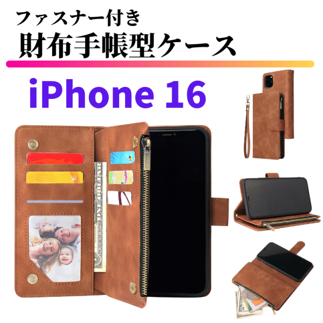 iPhone 16 スマホケース 手帳型 お財布 レザー カードケース ジップファスナー収納付 スタンド おしゃれ アイフォン カード入れ ストラップ付 大容量 耐衝撃 TPU素材 手帳 iPhoneケース iPhone16 シックスティン ブラウン