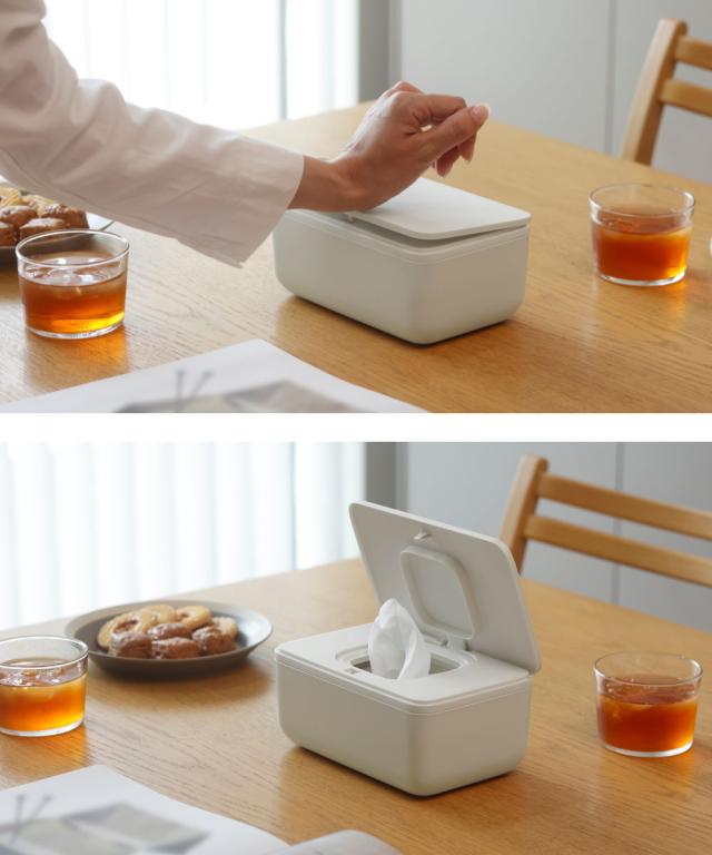 ワンタッチで簡単に開けられるので、フタの開閉が片手でできます。取り出し口が大きいのでシートが出しやすく、片手がふさがっている状態でもお手軽にお使いいただけます。