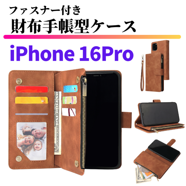 iPhone 16Pro スマホケース 手帳型 お財布 レザー カードケース ジップファスナー収納付 スタンド おしゃれ アイフォン カード入れ ストラップ付 大容量 耐衝撃 TPU素材 手帳 iPhoneケース iPhone 16 Pro シックスティン 16プロ ブラウン