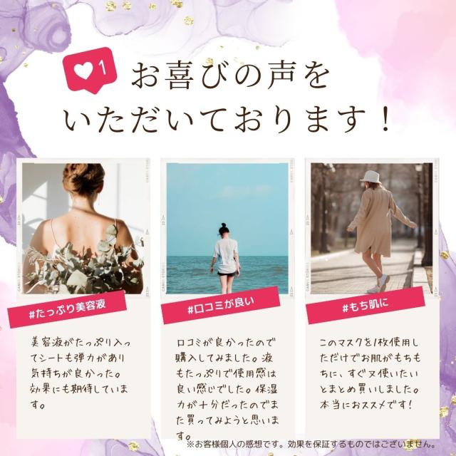 - 液ダレしないふかふかシートマスク。お化粧前に私用、オデコのちりめんシワが出ませんでした。 お化時のモロモロも一切なく、綺麗に仕上げる事が出来ました。 無臭なので、お仕事の日にも使えるなって思いました。