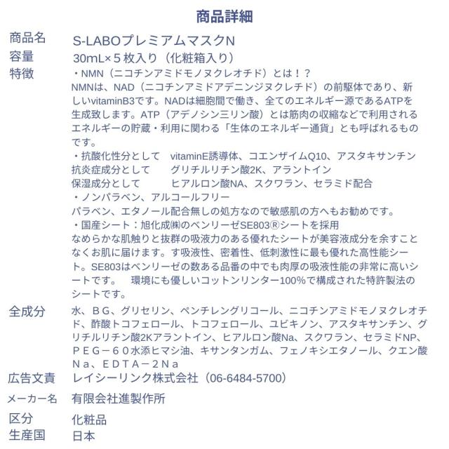NMN プレミアムケアマスク S-LABO オールインワンシートマスク5枚(化粧箱入) パック シートマスク フェイスマスク フェイスパック ベンリーゼマスク使用 パラベン・エタノールフリー 正規品