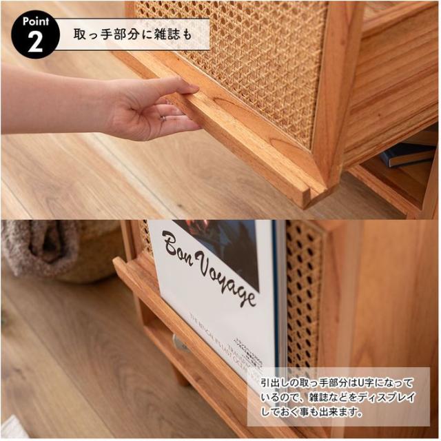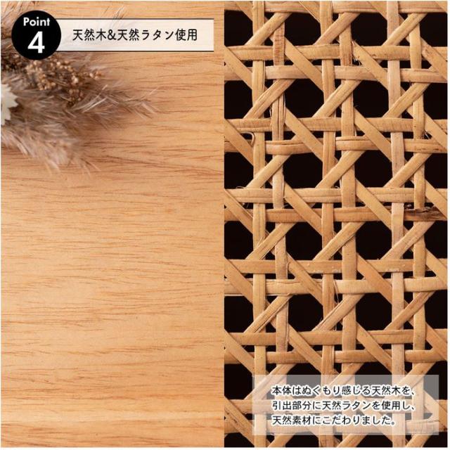 ●使いやすさとデザイン性に着目したシンプルなナイトテーブル。 ●ナチュラルな天然木とかごめ編みラタンを使用した、1点1点異なる表情が楽しめるテーブル。 ●ナイトテーブルとしてだけでなく、サイドテーブルやドレッサーとしてもおすすめ。 ●引き出しはたっぷり収納できる大容量サイズ。 ●ラタン部分が空気を通してくれるので通気性も◎ ●引き出しの取っ手部分はU字になっているので、雑誌などのディスプレイにも。 ●引き出しの下部分はオープン収納になってり、サッと取り出したい物を入れておくのに便利。 ●本体はぬくもり感じる天然木を。引き出し部分には天然ラタンを使用し、天然素材にこだわったテーブル(天然素材の為、1点1点個体差が有ります)