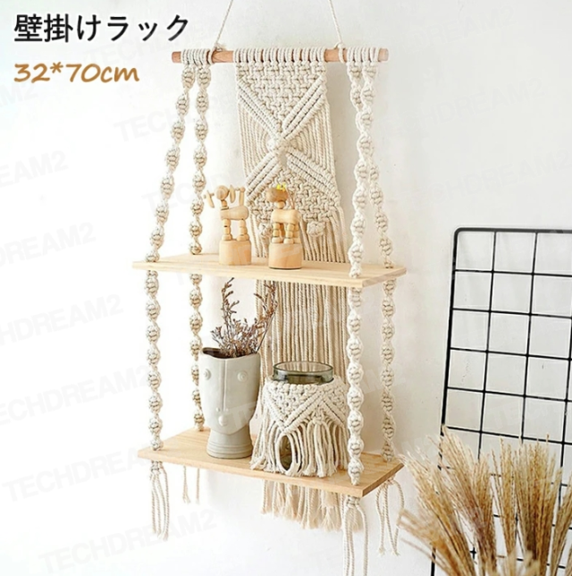 マクラメ 壁掛けラック 手作り 編み 壁掛け棚 木製 収納ラック 壁飾り マクラメ タペストリー 綿ロープ 植物ハンガー マクラメ編み タッセル 吊り下げタペスト