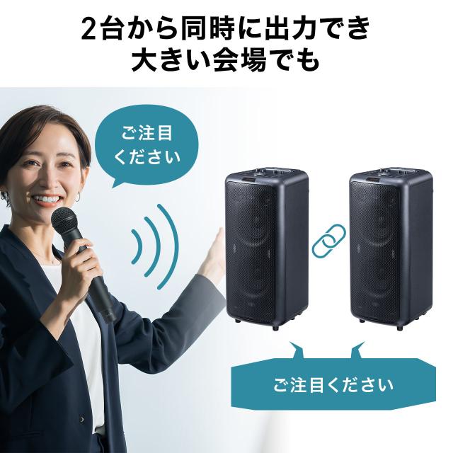 ●ワイヤレスマイク2本を同梱しており自由に移動しながらの同時使用が可能です。別売りの有線マイクを追加することで最大マイク3本まで同時利用することが可能です。
