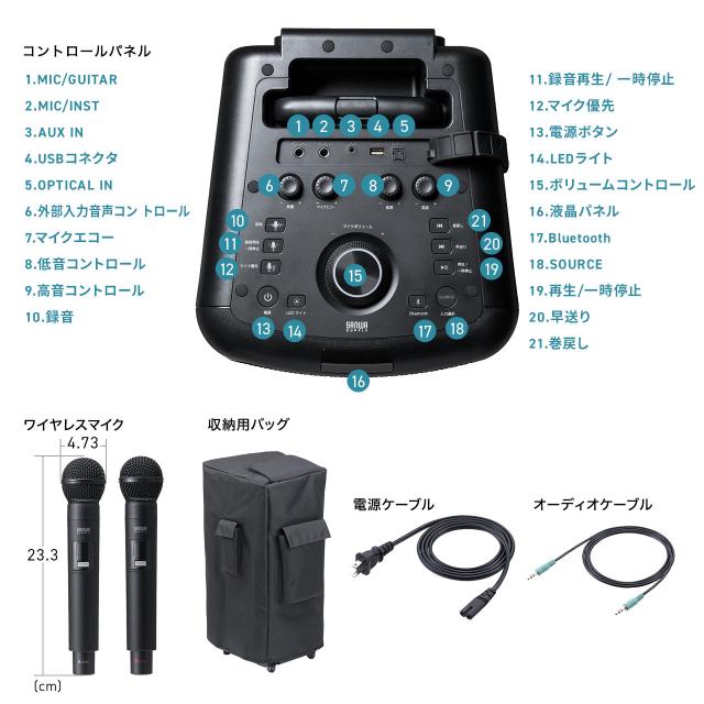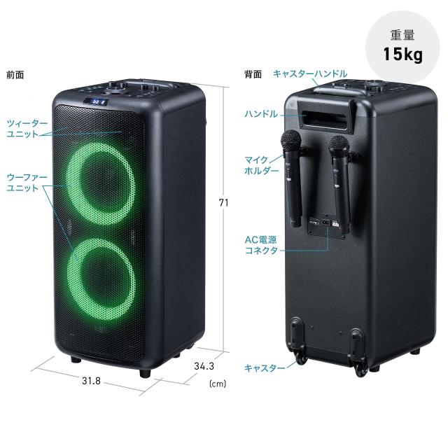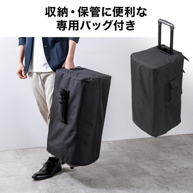 イベントスピーカー 拡声器 ワイヤレスマイク 2本付属 最大180W LED搭載 収納バッグ付き[400-SP113]