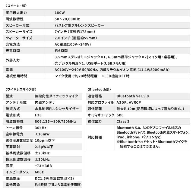 ⇒ご購入の前にご確認下さい最大180Wの大出力でイルミネーションLEDを搭載したワイヤレスマイク2本対応のバッテリー内蔵ワイヤレスマイク付き拡声器スピーカー。